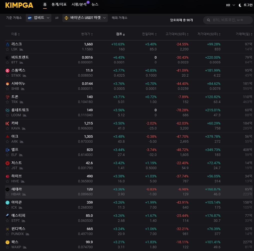 거래량순을 누르면 코인들이 정렬되어 차트도 확인가능하고 김프(%)를 확인할수있습니다.