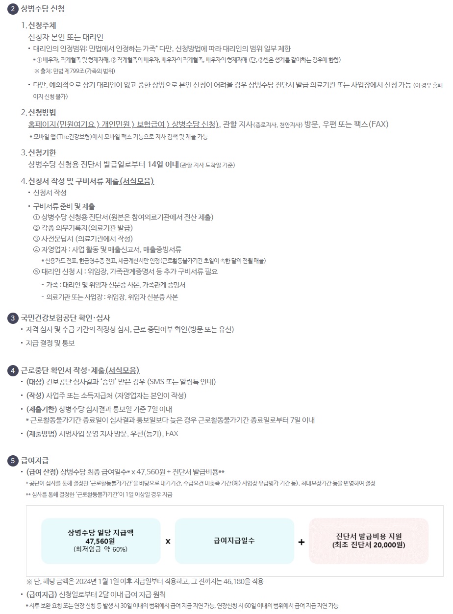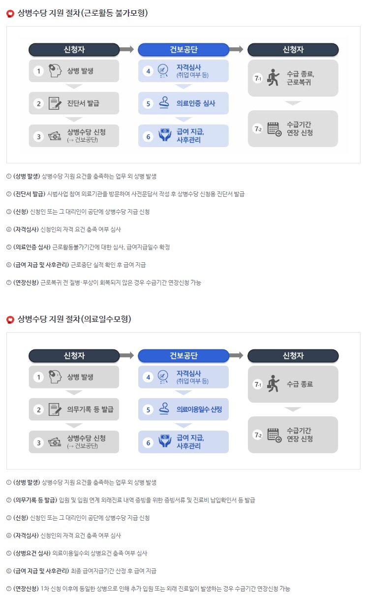 예를 들어, 근로자는 부상 또는 질병으로 인하여 적어도 14일 이상 근무할 수 없어야 하고, 상해나 질병의 종류와 정도에 따라 상병 수당을 받을 수 있는 기간이 달라질 수 있다. 상병급여에 대한 자세한 사항은 국민건강보험공단 홈페이지 또는 전화상담센터(1577-1000)를 참조하면 된다.