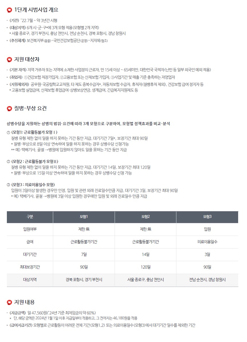 상병급여제도는 근로자가 업무와 관련이 없는 부상이나 질병 등으로 경제활동이 어려울 때 치료에 집중할 수 있도록 소득을 보전하는 제도다. 2022년 7월부터 1년간 6개 지역에서 시범사업으로 시작되어 현재 2단계 시범사업이 진행 중이다.