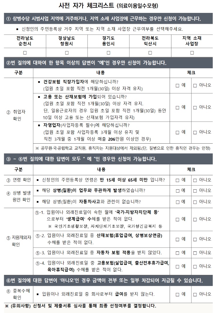 상병수당구역 상병급여는 현재 시범사업으로 운영되고 있으며, 시범사업 지역에 거주하는 사람만 신청할 수 있다. 2023년 기준 상병급여 시범사업 지역은 다음과 같다.