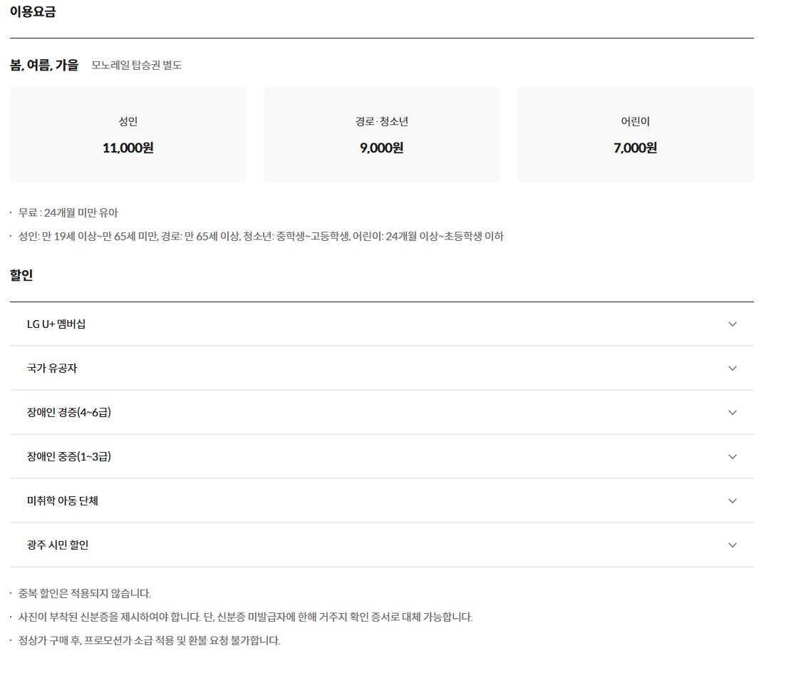 장애인 중증(1~3급) ➡ 3000원 할인 , 가을 단풍시즌(10,11월) 할인 미운영